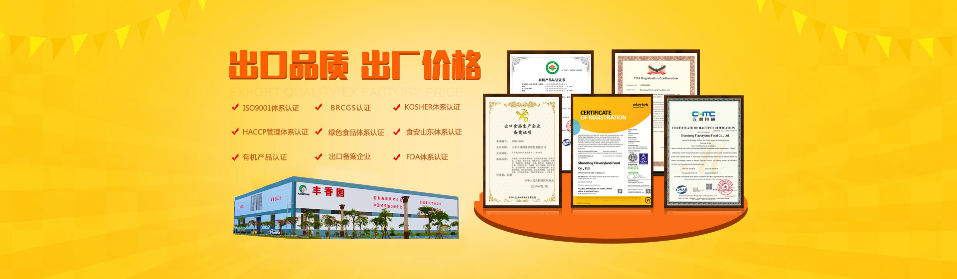 公司獲得HACCP國(guó)際質(zhì)量體系認(rèn)證、ISO9001:2015質(zhì)量管理體系認(rèn)證,產(chǎn)品獲得美國(guó)FDA認(rèn)證、美國(guó)、歐盟有機(jī)食品認(rèn)證、英國(guó)BRC體系認(rèn)證、A級(jí)綠色食品認(rèn)證、GB國(guó)標(biāo)有機(jī)食品認(rèn)證。